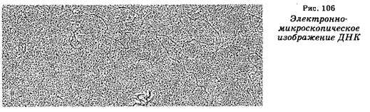 Молекулы ДНК являются линейными макромолекулами, представляющими собой длинные двойные цепи (тяжи) полимеров, составленных из мономеров, получивших название нуклеотидов (малых органических молекул) и являющихся строительными блоками ДНК. Электронномикроскопическое изображение ДНК показано на рис. 106.