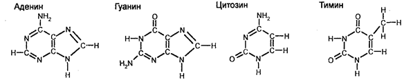 У всех живых существ макромолекулы ДНК построены по одному и тому же плану. Они слагаются в основном из одних и тех же нуклеотидов, каждый из которых содержит по одной молекуле фосфорной кислоты и сахара, а также одно из четырех азотистых оснований — аденин, гуанин, цитозин или тимин. Аденин и гуанин являются пуриновыми основаниями, тогда как тимин и цито- зин — пиримидиновыми. Пурины и пиримидины называют основаниями по той причине, что в кислой среде они способны присоединять к себе ион H'1'. Пиримидины являются производными шестичленного пиримидинового кольца, тогда как пурины представляют основания, у которых второе пятичленное кольцо слито с шестичленным кольцом.
