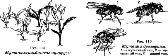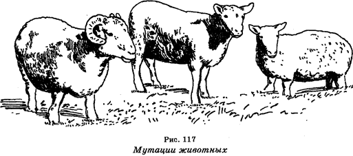 Мутантные организмы (мутанты) — это организмы, содержащие в своем геноме одну или несколько мутаций. Мутантные организмы могут отличаться от исходных (организмов дикого типа) по самым различным свойствам — морфологическим, физиологическим, биохимическим и другим. Например, у микроорганизмов мутации сопровождаются изменением формы колоний, питательных потребностей, отношения к лекарственным веществам и т. д. У высших растений мутации сопровождаются изменениями качественных и количественных признаков (рис. 115). У насекомых мутанты отличаются от исходных организмов по форме и окраске тела, крыльев, конечностей, глаз, реакции на свет, серологическим свойствам и т. д. (рис. 116). У млекопитающих мутации также ведут к изменению многих качественных и количественных признаков (рис. 117). У человека мутации приводят к различным отклонениям от нормы и сопровождаются наследственной патологией (см. гл. XIII). В целом можно сказать, что мутации являются вредными, полезными или нейтральными для организмов. Но важно помнить, что мутанты остаются организмом того же вида, что и организм дикого типа, из которого они произошли.