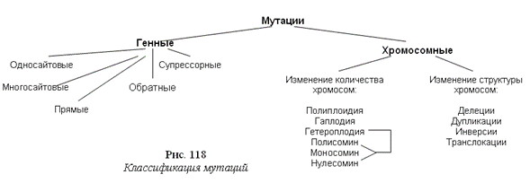 В зависимости от локализации в клетках различают генные (точечные) и хромосомные мутации (рис. 118).
