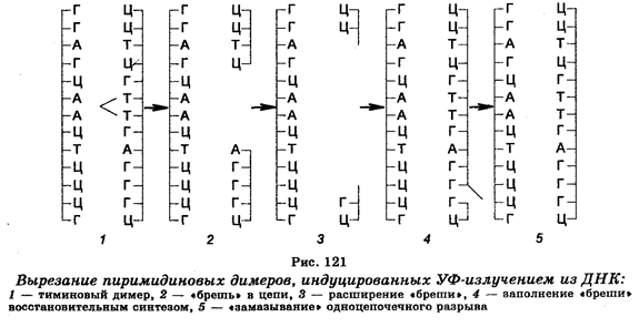 Характер и механизмы исправления повреждений наиболее полно изучены в случае повреждений, индуцированных УФ-излучени-ем. Клетки реагируют на УФ-излучение тем, что в их ДНК образуются повреждения, главные из которых представляют собой фотохимические изменения в пиримидиновых основаниях, переходящие в пиримидиновые димеры, в частности в тиминовые. Последние образуются за счет ковалентного связывания соседних тиминовых оснований в одной и той же цепи молекулы посредством присоединения углерода одного тимина к углероду другого тимина. Помимо тиминовых димеров в ДНК облученных клеток происходит формирование также цитозин-тиминовых и цитозин-цитозиновых димеров, однако частота их является меньшей. Димеризация фланкирующих оснований в гене сопровождается ингибированием транскрипции и репликации ДНК. Она ведет также к мутациям. В результате этого клетка может погибнуть или подвергнуться малигнизации.