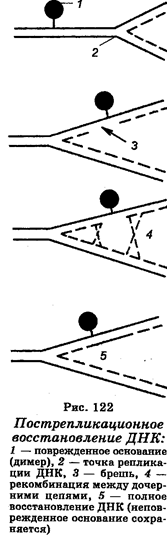 Третий механизм восстановления повреждений ДНК называют пострепликационным, или рекомбинационным восстановлением (рис. 122). Он заключается в том, что синтез ДНК в УФ-облученных клетках идет с нормальной скоростью вдоль хромосомы лишь до димера, перед которым он замедляется на несколько секунд, после чего начинается вновь, но уже на другой стороне димера. Поскольку ДНК-полимераза перескакивает через димер, то в дочерней цепи ДНК образуется брешь. Вследствие этого район, содержащий димер в одном дуплексе, будет интактным в сестринском дуплексе, т. е. в дочерних молекулах ДНК одна цепь будет содержать пиримидиновые димеры, тогда как другая будет иметь бреши, которые фактически являются вторичными повреждениями. Следовательно, район, содержащий димеры в одном дуплексе, полностью сохраняется в сестринском дуплексе. Этот процесс заканчивается рекомбинацией вдоль молекулы ДНК после ее репликации, при которой дочерняя цепь, несущая в каком-либо участке брешь, спаривается другой дочерней цепью (комплементарной), несущей брешь в другом месте. Это спаривание позволяет восстановительный синтез, который обеспечивает восстановление правильной последовательности района в каждой бреши. В качестве шаблона используется соответствующий интактный район другой дочерней цепи. Рекомбинационные события на уровне каждой бреши приводят к реконструкции интактной молекулы ДНК, способной к дальнейшей репликации. Рекомбинационное восстановление ДНК обеспечивается рядом белков-рекомбиназ.