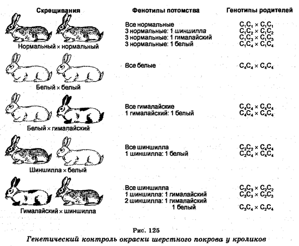 Сейчас известно, что некоторые признаки контролируются более чем двумя аллелями, т. е. существуют множественные аллели. Например, окраска шерстного покрова у кроликов (рис. 125) контролируется четырьмя аллелями (С1, С2, С3, C4. В случае человека группы крови по антигенам А и В контролируются тремя аллелями, (см. гл. XIII). Однако их наследование также подчиняется первому закону наследственности.