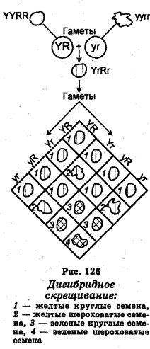 скрещивания называют дигибридными. Здесь мы рассмотрим одно из менделевских дигибридных скрещиваний, в котором в качестве исходных были использованы гомозиготные доминантные растения, дающие семена круглой формы и желтого цвета, и гомозиготные рецессивные растения, дающие семена шероховатой формы и зеленого цвета (рис. 126).
