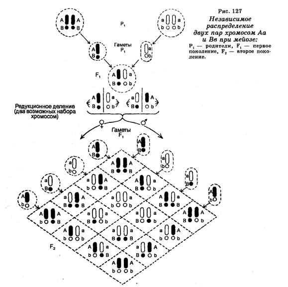 Расщепление генов происходит при гаметогенезе во время мей-отических делений. При мейозе хромосомы расходятся и проходят в разные гаметы, причем каждая гамета получает по одной хромосоме (гомологу) из пары хромосом. Независимое распределение генов также может быть объяснено поведением хромосом при мейозе (рис. 127).