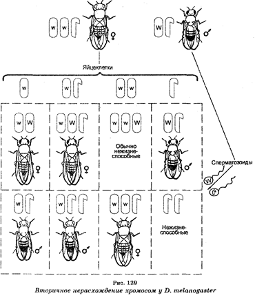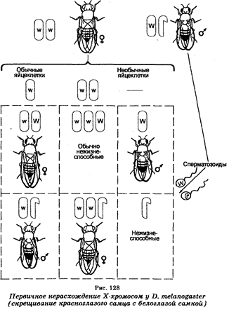 Еще в 1910 г. Т. Морган (1886-1945) установил, что половые хромосомы участвуют также в контроле и ряда признаков. В его экспериментах, заключающихся в скрещиваниях белоглазых дрозофил-самок с красноглазыми дрозофилами-самцами, оказалось, что гибридное потомство состояло из красноглазых самок и белоглазых самцов. Однако среди гибридов встречались отдельные красноглазые самцы и белоглазые самки, появление которых было неожиданным, исходя из особенностей передачи хромосомы Х и нахождения на ней локуса гена, контролирующего белый цвет глаз. Анализируя этот случай, К. Бриджис (1916) предположил, что «необычные» белоглазые самцы несут по две Х-хромосомы, унаследовав их от своих «матерей», тогда как «необычные» красноглазые самцы имеют одну Х-хромосому, унаследовав ее от «отцов». Объясняя это предположение, К. Бриджис допустил, что исходные белоглазые самки продуцировали «необычные» гаметы, содержащие либо две хромосомы XX, либо ни одной хромосомы Х (наряду с гаметами, обычно содержащими по одной хромосоме X) в результате нерасхождения при мейозе их хромосом XX. Если такие «необычные» гаметы подвергались оплодотворению сперматозоидами красноглазых самцов, то это приводило к образованию зигот четырех типов: а) белоглазых самок, б) красноглазых самцов, в) особей с 3 хромосомами Х нежизнеспособных, г) особей без хромосомы Х (также нежизнеспособных). Назвав это явление первичным нерасхождение хромомсом (рис. 128). К. Бриджис затем цитологически показал, что в соматических клетках «необычных» белоглазых самок F, вместо хромосом XX присутствуют две Х и одна Y-хромосома (XXY).