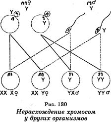 Оплодотворение яйцеклеток каждого из этих типов сперматозоидами нормального красноглазого самца приводило к образованию зигот восьми типов. Однако эти зиготы будут формироваться не с одинаковой частотой, поскольку мейоз у самок XXY связан с тем, что расхождение двух хромосом Х имеет место лишь в 92% овоцитов Объясняя вторичное нерасхождение хромосом, К. Бриджис допустил, что все белоглазые и отдельные красноглазые самки должны обладать не только парой хромосом X, но и хромосомой Y, тогда как красноглазые самцы в отличие от таких самцов, отмечаемых при первичном нерасхождении, должныиметь Y-хромосому и быть плодовитыми. Что касается отдельных белоглазых самцов, то они должны обладать одной хромосомой Х и двумя хромосомами Y. Эти допущения К. Бриджис доказал цитологически, найдя в соматических клетках дрозофилы хромосомы во всех сочетаниях, приведенных выше. Это открытие было показано на примере и других организмов (рис. 130).