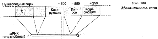 Приведенные выше данные показали, что наименьшей генетической единицей является пистрон, который, как стали считать, детерминирует синтез одного полипептида. У прокариот гены функционально активны на всем протяжении. Однако у эукариот сегменты ДНК, соответствующие индивидуальным генам, характеризуются мозаичностыо (рис. 133). Эта мозаичность определяется наличием в генах эксонов, кодирующих белки, и интронов, лишь переписываемых в мРНК, но не транслируемых. Во многих генах обнаружено по нескольку интронов (см. гл. XII).