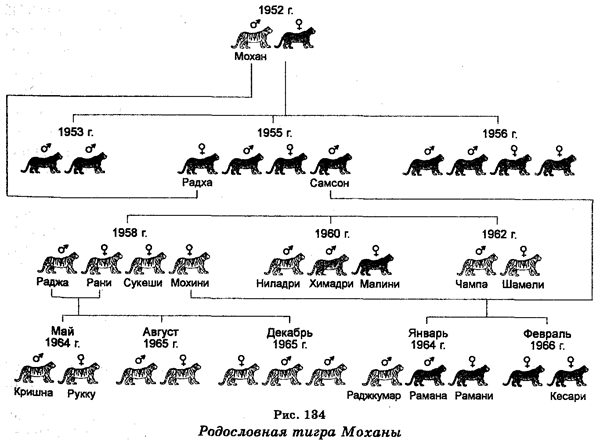 8. В 1952 г. в одном из районов Индии был пойман белый тигр (самец), которого затем скрестили с желтым тигром. Потомство от этого скрещивания приведено на рис. 134. Руководствуясь этой родословной, дайте ответы на следующие вопросы: а) Если допустить, что окраска шерсти контролируется парой аллелей, то является ли этот признак доминантным или доминантность отсутствует? б) Если окраска шерсти является примером наследования доминантности, то какая окраска (белая или желтая) является доминантным признаком? в) Определите и запишите, используя какие-либо символы, генотипы тигров Мохана, Самсона, Мохини, Малини и Кришны. г) Каково ожидаемое отношение потомства с желтым шерстным покровом к потомству с белой шерстью, полученного после скрещивания Самсона и Мохини? д) Какова вероятность рождения четырех желтых и одного белого тигрят в скрещиваниях Самсона и Мохини?