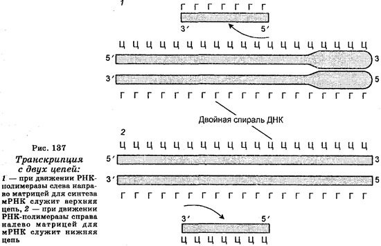 Синтез молекул мРНК происходит в ядре клетки и очень сходен с репликацией ДНК. Отличие заключается лишь в том, что в качестве матрицы (шаблона) для копирования цепи мРНК используется лишь одна цепь ДНК. При этом копирование мРНК может начаться с любого пункта одиночной цепи ДНК, к которому прикрепляется РНК-полимераза и который называют промотором. Однако возможны случаи, когда два даже соседних гена могут транскрибироваться с разных цепей. Таким образом, для транскрипции может быть использована любая из двух цепей ДНК (рис. 137), но в любом случае одна из цепей транскрибируется одними РНК-по-лимеразами, другая — другими РНК-полимеразами, причем выбор цепи ДНК для транскрипции определяется промоторной последовательностью, которая задает направление движения РНК-полиме-разы (рис. 138).