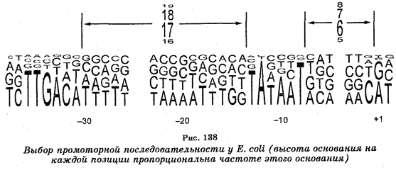 Синтез РНК обеспечивается РНК-полимеразами. У прокариот синтез мРНК, рРНК и тРНК осуществляет лишь один тип РНК-полимеразы, количество молекул которой в клетках достигает до 3000 молекул. Каждая из молекул этой РНК-полимеразы состоит из шести полипептидов, какими являются субъединицы р' и (3 (м. м. 155 ПОО и 151 000 соответственно), двух субъединиц а м. м. 36 000 и еще двух низкомолекулярных субъединиц (8 и ю). Инициация транскрипции обеспечивается субъединицей 5 — РНК-полимеразы, которая является, по существу, фактором инициации транскрипции. Как отмечено выше, связывание РНК-полимеразы с ДНК происходит на участке, называемом промотором и содержащем старт-сигнал для синтеза РНК, и контролируется белковым фактором. У Е. coli промоторы содержат последовательность ТАТААТ (бокс Прибнау), отстоящую от сайта начала транскрипции мРНК на расстояние в шесть оснований. После присоединения к промотору РНК-полимераза раскручивает в этом участке двойную спираль ДНК, обнажая цепи, каждая из которых служит затем матрицей, на которой происходит спаривание комплементарных оснований ДНК и рибонуклеозидтрифосфатов. Как только произошло спаривание двух первых мономеров РНК-полимераза продвигается дальше, обнажая дальнейшие участки цепей ДНК и добавляя последующие мономеры РНК. Удлинение цепи РНК происходит до тех пор, пока РНК-полимераза на своем пути не встретит «стоп-сигнал» и не отделится затем как от ДНК-шаблона (матрицы), так и РНК.