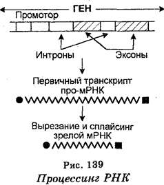 Для того чтобы про-мРНК стала «зрелой» мРНК, она еще в ядре вовлекается в процессинг, который заключается в том, что из про-мРНК с помощью ферментов «вырезаются» нетранслируемые участки (интроны), после чего транслируемые участки (эксоны) воссоединяются (рис. 139). Воссоединение называют сплайсингом (от англ. splice — сращивать). В результате процессинга образуются непрерывные последовательности зрелой мРНК, которые по своим размерам значительно меньше молекул про-мРНК, т. е. являются более короткими (табл. 20). Молекулы гяРНК содержит обычно более 50 000 нуклеотидов, тогда как после сплайсинга мРНК содержит всего лишь 500-3000 нуклеотидов.