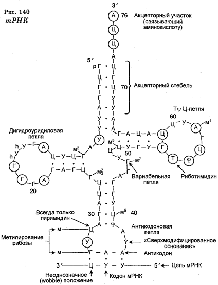 В молекуле тРНК вопреки ее одноцепочечной структуре имеет место комплементарное спаривание оснований, а это ведет к определенной конформации тРНК, заключающейся в том, что четыре ее сегмента формируют свернутую структуру (вторичную), которая имеет форму клеверного листа (рис. 140). В свою очередь эта структура подвергается дальнейшему свертыванию, превращаясь в так называемую многоскладчатую L-образную форму. Важнейшая особенность тРНК заключается в том, что по обоим концам L-образной фигуры сохраняются неспаренные нуклеотиды. Нуклеотиды одного конца фигуры формируют антикодон, а нуклеотиды другого конца (3'-конца) образуют последовательность (ЦЦА), обеспечивающую ковалентную связь с присоединяемой свободной аминокислотой.