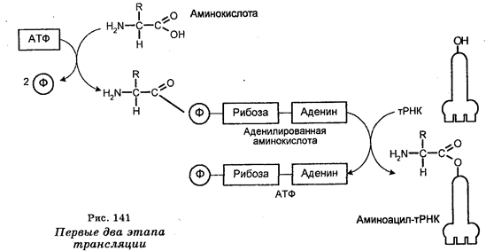Первый этап трансляции происходит в цитоплазме и заключается в комбинировании каждой аминокислоты с АТФ (в образовании аденилированной аминокислоты) и специфическим ферментом аминоацил-тРНК-синтетазой (рис. 141). В результате этого устанавливается связь между фосфатом АМФ и карбоксильной группой аминокислоты (-Р-О-С-), которая приводит к образованию комплексов, состоящих из аминокислоты, АМФ и специфического фермента. Пирофосфаты в процессе образования этих комплексов удаляются. Следует заметить, что для каждой аминокислоты существует своя синтетаза, т. е. в клетках имеется 20 разных синтетаз.