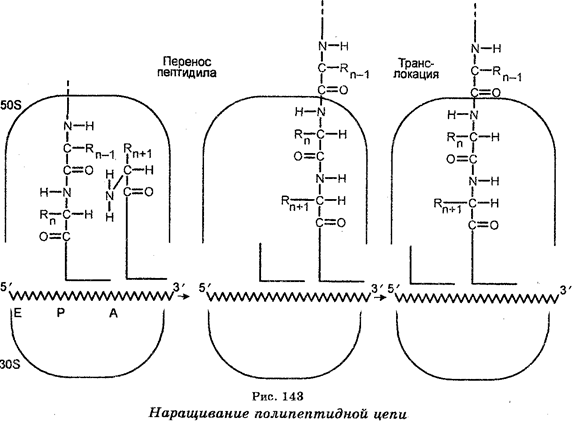 После связывания с мРНК аминоацил-тРНК помещают (включают) аминокислоты вдоль молекулы мРНК в последовательности, соответствующей последовательности триплетов азотистых оснований в мРНК (рис. 142). Наращивание полипептидной цепи обеспечивается тем, что при синтезе белка рибосомы (полисомы) движутся вдоль цепи мРНК, т. е. рибосомы осуществляют считывание мРНК от одного конца до другого (рис. 143). Эффективность работы рибосом чрезвычайно велика. Например, у бактерий одна рибо-сома за 1 секунду присоединяет к полипептидной цепи свыше 20 аминокислот. Одновременно происходит формирование пептидных связей, обеспечиваемое несколькими ферментами-трансферазами, один из которых катализирует одновременно связывание аминоа-цил-тРНК с рибосомной, происходящее в присутствии ГТФ как кофактора. Каждая пептидная связь образуется ковалентным связыванием атома углерода карбоксильной группы первой аминокислоты с аминогруппой второй аминокислоты. При этом в процессе связывания происходит открепление тРНК первой аминокислоты от углерода карбоксильной группы своей аминокислоты. Каждая вновь добавляемая аминокислота встает на место, следующее за аминокислотой, добавленное ранее. Как видно, полипеп-тидная цепь наращивается с карбоксильного конца, а аминокислоты добавляются последовательно. Трансляция осуществляется в направлении от 5'- к 3'-концу полипептидного тяжа.