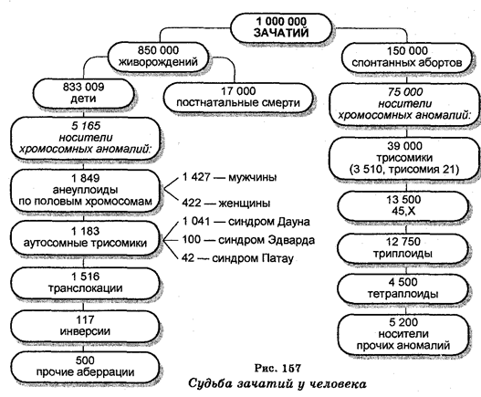 Особое значение наследственная патология приобрела в наше время в связи с химическим и радиационным загрязнением среды обитания. Представления о судьбе зачатий дает рис. 157. В соответствии с расчетами от 1/4 до 1/2 всех известных болезней представляют болезни генетической природы. Наследственные болезни стоят на третьем месте после болезней сердечно-сосудистой системы и рака. Считают, что около 3% новорожденных страдают от того или иного генетического дефекта. Одна из каждых гамет человека несет ошибочную информацию, введенную новой мутацией, большая часть которых «оплачивается» ранними абортами. Описано свыше 3000 разных наследственных аномалий, являющихся проявлением мутаций, которые в совокупности представляют собой генетический груз современного человечества.