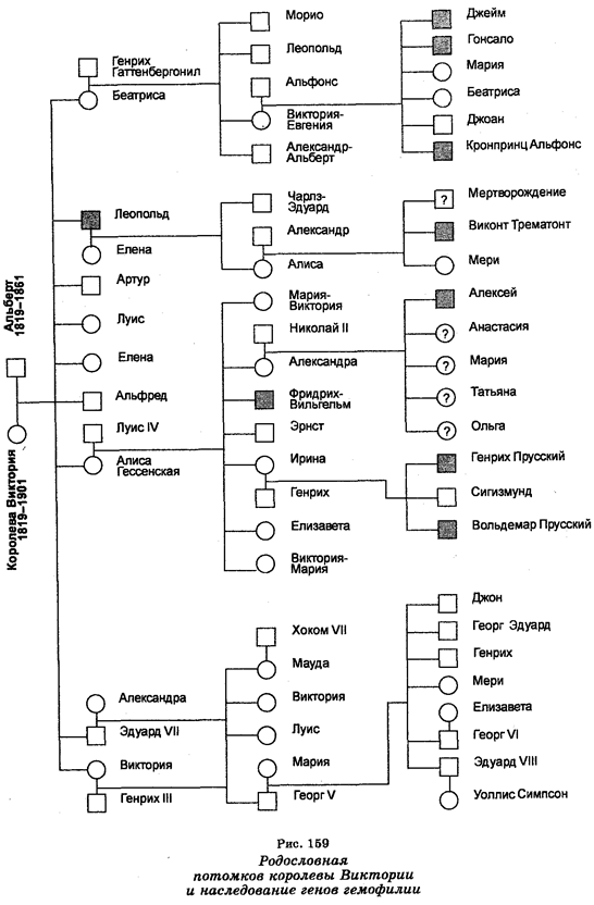 Передача рецессивного гена, детерминирующего гемофилию от гетерозиготных носительниц к их дочерям, внучкам и т. д., которые становятся гетерозиготными носителями и сыновья которых в 50% случаев болеют гемофилией, хорошо прослеживается при ознакомлении с генеалогией некоторых царствовавших семей в Европе, которая восходит к английской королеве Виктории, бывшей гетерозиготной по полулетальному гену гемофилии в Х-хромосоме (рис. 159). От гемофилии умерли три правнука королевы Виктории, испанские инфанты Альфонсо, Гонзалес и Хуан, являвшиеся сыновьями Альфонса XIII и Виктории-Евгении Баттенбергской. Гемофиликом был также сын последнего русского царя Николая II, который унаследовал ген гемофилии от своей матери, бывшей царицы Александры Федоровны (Алисы). Последняя унаследовала этот ген через мать от своей бабки королевы Виктории.