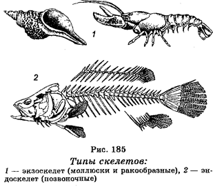 Скелет выполняет опорную и защитную функции. У беспозвоночных скелетом являются ригидные структуры, имеющие самый разнообразный характер и подразделяемые на эндос-келет и экзоскелет (рис. 185).