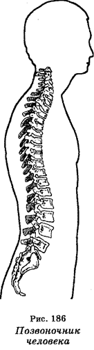 Количество хвостовых позвонков зависит от длины хвоста. У лягушек, например, хвостовые позвонки сливаются в одиночную кость (уростиль), у птиц имеется 4-6 хвостовых позвонков, которые сливаются также в уростиль. Некоторые ископаемые птицы (археоптерикс) имели длинный хвост, состоящий из 20 позвонков. У млекопитающих количество позвонков в хвосте зависит от вида. Прямохождение человека вело к искривлению позвоночника, т. е. это оказалось «платой» за Прямохождение (рис. 186).