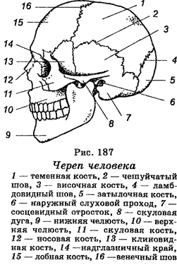 в зависимости от принадлежности животных к тому или иному классу. У костных рыб, например, количество костей черепа превышает 100, в то время как у земноводных оно равно 15-19, у пресмыкающихся — от 40 до 70, у птиц — 20, у примитивных млекопитающих (Didelphis) — 48, у шимпанзе — 22, у человека — 27 (рис. 187). Снижение количества костей черепа в эволюции от рыб до млекопитающих является результатом потери индивидуальных костей или их слияния с другими костями.