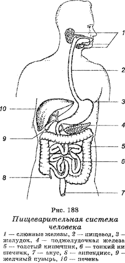 У человека в состав пищеварительной системы входит рот, глотка, пищевод, желудок, кишечник, слюнные железы, печень, желчный пузырь и панкреатическая железа (рис. 188). Все отделы же-лудочно-кишечного тракта построены из четырех слоев.