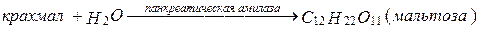 Переваривание углеводов начинается в полости рта, где слюнная амилаза, (птиалин) действует на крахмал и гликоген, превращая их в смесь Д-глюкозы, мальтозы и олигосахаридов. Переваривание углеводов завершается в тонком кишечнике, где переваренный под действием птиалина крахмал подвергается дальнейшему воздействию панкреатической амилазы, конвертируется в мальтозу. В конечном итоге вся мальтоза под действием маль-тазы конвертируется в глюкозу.