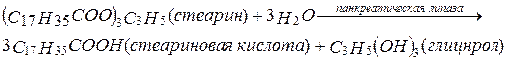 Переваривание жиров начинается в тонком отделе кишечника, где панкреатическая липаза с помощью желчных кислот и белка колипазы конвертирует жиры в глицерол и жирные кислоты. Одна молекула жира дает одну молекулу глицерола и три молекулы жирной кислоты: