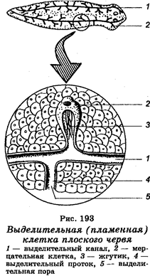 У плоских червей, ротифер и некоторых немертин развивается примитивная выделительная система в виде протонефридий, которые представляют собой слепые канальцы, разветвленные по телу и снабженные на конце пламенной клеткой, проникающей в канадец (рис. 193). Продукты выделения поступают в цитоплазму пламенных клеток, а затем в канальцы, объединяющиеся и открывающиеся наружу в виде пор. Через эти поры продукты выделения и выходят в окружающую среду.