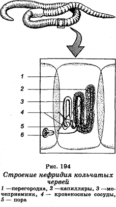 У кольчатых червей, у которых появляется вторичная полость (целом), развивается выделительная система в виде метанефридий, представляющих собой извитые канальцы, располагающиеся по два в каждом сегменте тела (рис. 194). Эти канальцы открываются во вторичную полость тела одним концом (нефро-стомом), снабженным мерцательными ресничками, а наружу (на боковой стороне гельминта) — другим (нефри-диопорой).