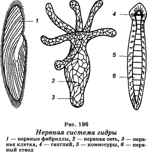 Начало нервной системы простейшего типа отмечается у ки-шечнополостных (рис. 196). Причем первым этапом в ее возникновении является дифференциация эпителиальных клеток в нейро-сенсорные элементы. Поверхность этих клеток выполняет роль рецептора, в то время как от их основания разветвляются нервные нити в сторону подлежащих мышечных клеток. Истинные нервные клетки, обладающие функцией проводимости, наблюдаются впервые также у кишечнополостных, у которых впервые появляются нейроны, секретирующие катехоламины.