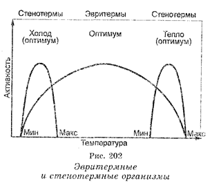 На основе способности организмов существовать в условиях разных. температур их классифицируют на эвритермные организмы, которые способны существовать в условиях значительных колебаний температур, и сте-нотермные организмы, которые могут существовать лишь в узком диапазоне температур (рис. 202). Эвритермны-ми являются организмы, обитающие в основном в условиях континентального климата. Примером их являются животные многих видов, обитающие в пресных водоемах и способные выдерживать как промерзание воды, так и ее нагревание до 40-45 С. Эвритермные организмы выдерживают самые жесткие температурные условия. Например, личинки многих двукрылых могут жить в воде при температуре 50°С. В горячих источниках (гейзерах) при 85 °С и более обитают многие виды бактерий, водорослей, гельминтов. С другой стороны, арктические виды бактерий и водорослей обитают в очень холодной морской воде. Для многих эвритермных организмов характерна способность впадать в состояние оцепенения, если действие температурного фактора «ужесточается». В этом состоянии резко снижается уровень обмена веществ. Примерами оцепенения являются оцепенение насекомых или рыб при значительном падении температуры. У млекопитающих (медведи, барсуки и др.) оцепенение проявляется в виде зимней спячки, когда резко снижается обмен веществ, но температура тела при этом падает незначительно.