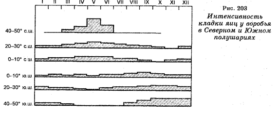 У животных многих видов длительность светового дня оказывает влияние на их половую функцию, стимулируя ее в период увеличения светового дня (фотопериода) и угнетая ее при уменьшении светового дня (осенью или зимой). У птиц фотопериод влияет на яйцеклетки (рис. 203). Укорочение светового дня служит сигналом к миграции.