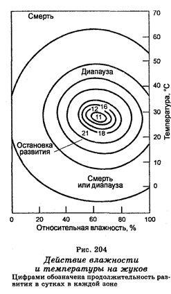 Большое значение в качестве абиотического фактора имеет комбинированное воздействие на организмы температуры и влажности (рис. 204).