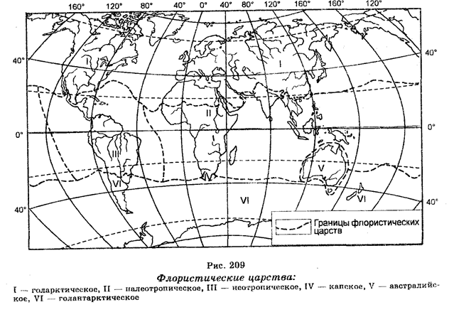 В соответствии с наиболее распространенной флористической классификацией различают голарктическое, палеотропическое, неотропическое, капское, австралийское и голантарктическое царства (рис. 209). Наша страна укладывается в границы Голарктического царства, которое охватывает Европу, Северную Африку, Северную Америку и ту часть Азии, которая не является тропической. Голарктическая флора представлена такими семействами растений, как лютиковые, гвоздичные, барбарисовые, березовые, ивовые, магнолиевые, розоцветные, крестоцветные и др.