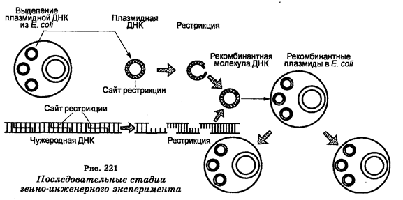 Методы генной инженерии используют в определенной последовательности (рис. 221), причем различают несколько стадий в выполнении типичного генно-инженерного эксперимента, направленного на клонирование какого-либо гена, а именно: