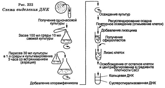 Рассмотрим методику выделения ДНК на примере ДНК плаз-мид. ДНК из плазмидосодержащих бактериальных клеток выделяют с помощью традиционной техники, заключающейся в получении клеточных экстрактов в присутствии детергентов и последующем удалении из экстрактов белков фенольной экстракцией (рис. 222). Полная очистка плазмидной ДНК от белков, РНК и других соединений проводится в несколько стадий. После того как клетки разрушены, например, с помощью лизоцима (растворены их стенки), к экстракту добавляют детергент, чтобы растворить мембраны и инактивировать некоторые белки. Большинство хромосомной ДНК удаляют из получаемых препаратов обычным центрифугированием.