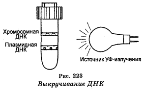 Часто для полной очистки используют хроматографию. Если требуется очень тщательная очистка, используют высокоскоростное центрифугирование в градиенте плотности CsCI с использованием этидия бромида. Оставшаяся хромосомная ДНК будет фрагментирована в линейную, тогда как плазмидная ДНК останется ковалентно закрытой. Поскольку этидий бромид менее плотен, чем ДНК, то при ультрацентрифугировании в центрифужной пробирке будет «выкручиваться» два кольца — плазмидная ДНК и хромосомная ДНК (рис. 223). Плазмидную ДНК отбирают для дальнейшей работы, хромосомную ДНК выбрасывают.