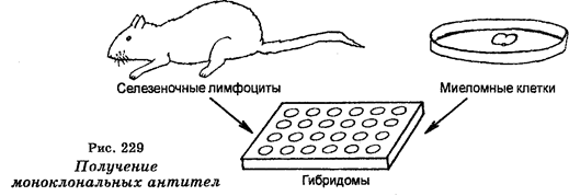 На стыке работ по изучению гибридизации клеток и иммуноло-гических исследований возникла проблематика, связанная с получением и изучением так называемых моноклональных антител. Как отмечено выше (см. § 96), антитела, продуцируемые организмом в ответ на введение антигена (бактерии, вирусы, эритроциты и т. д.), представляют собой белки, называемые иммуноглобулина-ми и составляющие фундаментальную часть защитной системы организма против возбудителей болезней. Но любое чужеродное тело, вводимое в организм, представляет собой смесь разных антигенов, которые будут возбуждать продукцию разных антител. Например, эритроциты человека обладают антигенами не только для групп крови А (II) и В (III), но и многими другими антигенами, включая резус-фактор. Далее, белки клеточной стенки бактерий или капси-да вирусов также могут действовать в качестве разных антигенов, вызывающих образование разных антител. В то же время лимфо-идные клетки иммунной системы организма обычно представлены клонами. Значит, даже только по этой причине в сыворотке крови иммунизированных животных антитела всегда представляют собой смесь, состоящую из антител, продуцируемых клетками разных клонов. Между тем для практических потребностей необходимы антитела только одного типа, т.е. необходимы так называемые моноспецифические сыворотки, содержащие антитела только одного типа, или, как их называют, моноклональные антитела.