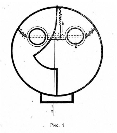 Вариант второй. Движение глаз вправо и влево. Форма глаз, как и в предыдущих вариантах, может быть различной: круглой, эллипсообpазной, вытянутой вверх или продолговатой. При продолговатой форме движение глаз более выразительно. Каждый глаз, выточенный из дерева или пенопласта, монтируется на отдельной вертикальной оси — 1, выгнутой таким образом, чтобы глаз свободно вращался в глазнице и не скользил по оси вверх и вниз (рис. 5, 6).
