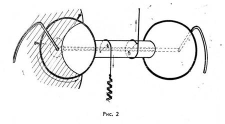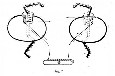 Еше один способ движения глаз в стороны без использования штырей и блоков. Глаза нужной формы вытачивают c небольшой шейкой c одной стороны (рис. 7). Монтируют их аналогичным способом, но ось крепят не горизонтально, как на рис. 4, a вертикально. Оба глаза тоже соединяют одной жилкой. Для этого берут отрезок жилки необходимой длины и, примерно, посередине завязывают узел. Конец жилки пропускают через отверстие в шейке правого глаза до упора и c другой стороны отверстия на жилке завязывают второй узел вплотную к шейке. Обматывают жилку вокруг шейки против часовой стрелки и, отмерив расстояние между глазами по оси, завязывают еще один узелок на жилке. Затем вставляют ее в отверстие на шейке левого глаза и вплотную к ней завязывают узел. Обматывают вокруг шейки глаза и направляют вниз. Оба конца жилки в натянутом виде закрепляют на рычаге-коромысле, как и в предыдущем варианте. Чтобы глаза при повороте останавливались в нужном положении, ставят стопор — маленькие гвозди или шурупы.