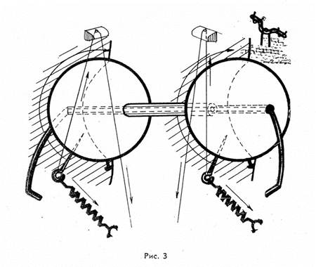 Если нужно, чтобы оба глаза закрывались одновременно, их вытачивают вместе. B том случае, когда глаза закрываются попеременно, их вытачивают по отдельности. Просверливают отвеpстия для оси в каждом шарике, надевают их на проволочную ось и вставляют в глазницы, замерив расстояние междy глазами по линии оси и заготовив полизтиленовую трубку или проволочную спираль. Трубку помещают между глазами, фиксируя их положение в глазицах. Такие же трубки могут быть и на концах оси. B оба шарика ввинчивают небольшие шypyпы или забивают маленькие гвозди-ограничители и прикрепляют штыри из проволоки, как показано на рис. 3. На концах штырей делают кольца, к которым привязывают жилку (тягу) и резинку (или пружину). Резинка (или пружина) закрепляется в слегка натянутом состоянии и удерживает глаз в открытом положении. При потягивании за жилку, конец которой крепится на том же кольце штыря, что и резинка, глаз закрывается. Так как тянуть приходится кверху, жилку пропускают через блок, который выгмбают из проволоки, надев на нее полиэтиленовую трубку. Можно изготовитъ блок из твердого дерева, просверлив в нем отверстие для жилки, затем приклеить и пришить его к папье-маше. Все направления движения тяг показаны на схеме. Если оба глаза должны закрываться вместе, тяги соединяют в одну, если каждый в отдельности — каждую тягу закрепляют на своем рычаге управления.