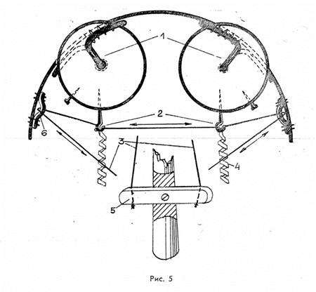 Чтобы глаза поворачивались в разные стороны на равное расстояние, штыри ставят параллельно друг другу и в этом положении соединяют их жилкой. От штыря жилку проводят через блок — 6 и закрепляют на рычаге-коромысле — 5, который в свою очередь крепят подвижно на ползунке гапита или ручке штока. Должен получиться замкнутый круг, и, при нажиме на коромысло c двух сторон, глаза поворачиваются. Пружина (или резинка) — 4, которyю также крепят на штыре — 2, должна вoзвращать глаз в исходное центральное положение. Чтобы во время движения глаза не скрипели, делают графитовую смазку. Если при повороте в одну или другую сторону глазное яблоко скрывается, ставят стопор — 7.