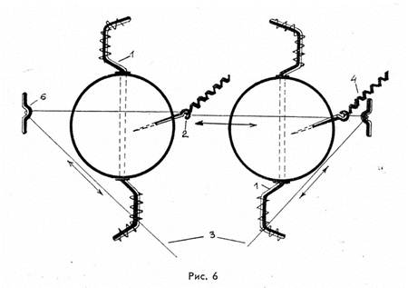 B глаза вбивают (деревянные) или вклеивают (пенопластовые) штыри-2, к которым крепят жилку (тягу) — 3 и пружинку — 4 или резинку, удерживающую глаз в центральном положении. И чем длиннее штырь, тем дальше жилка удалена от оси — 1, вокруг которой вращается глаз, a значит и рычаг-коромысло — 5, c помощью которого глаза приводятся в движение, тоже должен быть длиннее. Надо стараться точку крепления жилки на штыре не удалять от оси.