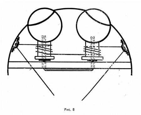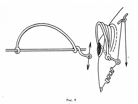 Внутри головы к колечку — 3 на рычаге — 8 прикрепляют пружину (или резинку) и жилку. Второй конец резинки закрепляют в папье-маше внизу головы так, чтобы веко оставалось открытым, a резинка была слегка натянута. Жилку пропускают через блок — 9 и направляют вниз, закрепив на рычажке. Кусок трикотажа вырезают по форме века. Один край приклеивают (или пришивают) к дуге века. Веко опускают вниз и в натянутом положении свободный край трикотажа подклеивают по окружности глаза к папье-маше. Нужно учесть, что силы натяжения трикотажа и резинки действуют в одном направлении и, чтобы не затрачивалось много усилий на закрывание века, резинка не должна быть тугой.