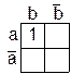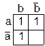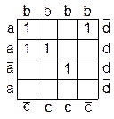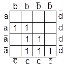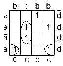Можно минимизировать заданное логическое выражение, объединив в группы стоящие рядом единицы и при этом исключать ту переменную, которая переходит из прямого в инверсное состояние. Объединять можно не только по вертикали и горизонтали, но и по краям, так как в общем случае карта Карно образует тор. Пример: