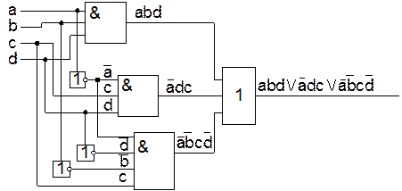 Каждое логическое выражение может быть представлено в виде функциональной схемы, состоящей из базового набора элементов И, ИЛИ, НЕ. Входными должны являться только прямые переменные.