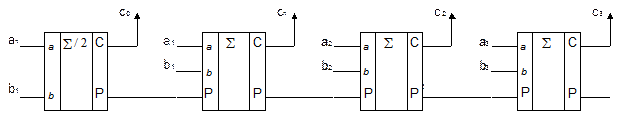 У параллельного с последовательным переносом числа a и b подаются параллельно и одновременно снимаются все разряды. Сколько разрядов содержится в суммируемых числах, столько необходимо и корпусов.