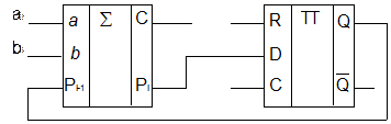 У последовательного сумматора операнды на входы a и b подаются последовательно. В каждый такт подается определенный разряд операндов. На выходе сумма также выдается последовательно. D-триггер обеспечивает задержку переноса с предыдущего разряда. Для того чтобы n-разрядов числа, должно пройти n тактов.