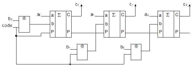 Для того чтобы выполнить операцию вычитания используют сумматор – вычитатель. Для его функционирования к обычной схеме сумматора добавляется схема формирования дополнительного кода.