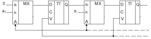 В качестве последовательного сдвигателя можно использовать схему последовательного регистра. Если необходимо разрешение записи, то использовать схему с мультиплексором.